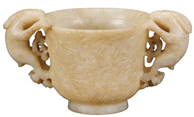 双耳杯一般认为是由古代羽觞发展而来,明代双耳杯继承传统,样式更为丰富。这件白玉双兔耳杯对于兔的形态把握精准,造型生动,左右呼应,工艺精湛。杯身满雕,前后阴刻四爪龙纹,是同类器物中的珍罕之作。