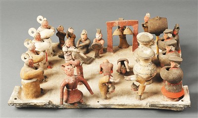 1969年,彩绘乐舞杂技陶俑出土于济南无影山汉墓,是一件随葬明器,重现了2000多年前流行的“百戏”表演精彩场面。此器中有21个陶俑,分别为7名乐工、7名观赏者、7名表演者,它们被固定在一个长67厘米、宽47.5厘米的陶盘上。陶盘两侧的观者宽衣深服、冠履整齐,显然是社会上层人物。右侧3人面前置有2只酒樽,象征着宴饮。陶盘后侧一排乐工,有的击鼓,有的敲钟,有的击磬,有的弹瑟,有的吹笙。身着花衣的2名女子挥动长袖,翩翩起舞。头戴尖顶小帽的4名男子正在表演杂技。还有1人身穿红袍,双臂张开,手中别无所持,似乎是歌唱者,它是陶盘中唯一一个身体可以自由转动的陶俑。