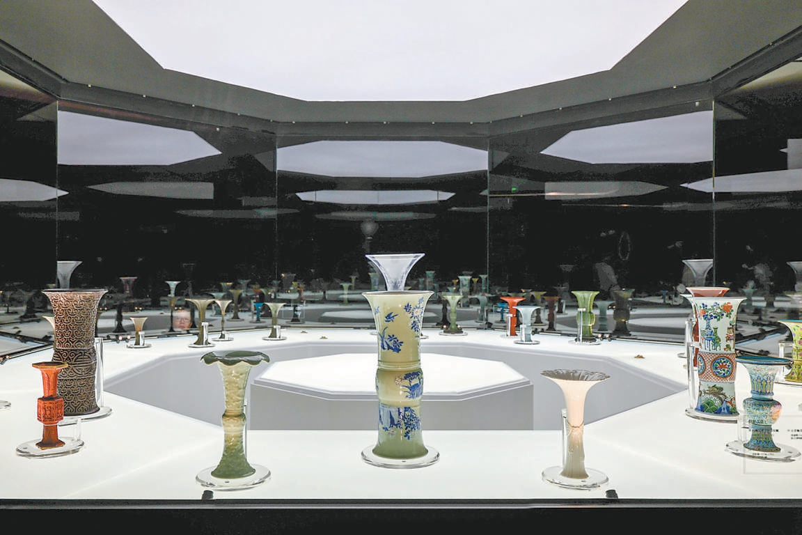古与今、模仿与创新的对比呈现,是本次展览一大特色。22件不同朝代的觚组成“八卦觚阵”,观感震撼,是这次展览的必看珍品。这种有点像喇叭的饮酒器,良渚文化时期就已诞生,被后世历代鉴藏、仿制并创新。沿着八边形展柜顺时针走,能看到商代的觚和宋至清代的仿制品。“仿制的觚有三个层次——材料、造型、纹饰都追随传统的‘忠于典范’,纹饰加入时代风格的‘采择英华’,材料、纹饰变化多端的‘但取古意’。”张燕芬说,这些变化让人看到古代艺术在继承中发展、在发展中创新的绵延相继。