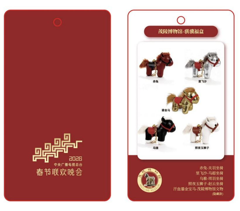 同步推出的马年挂饰盲盒——“骐骥福盒”则以“马”为核心文化意象,深度融合文博资源与春晚IP,系统梳理中国名马文化谱系:从楚汉争霸中的“里飞沙”,到三国传奇里的“赤兔马”,也将茂陵博物馆“镇馆之宝”作为隐藏款融入其中。这些承载忠义、勇毅精神的历史符号,在现代设计语言的诠释下焕发新生,构建起一条从神话传说到文物实证、从精神象征到生活美学的完整文化叙事链。