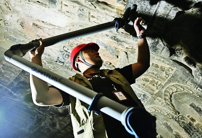 龙门石窟研究院工作人员在河南洛阳龙门石窟古阳洞使用关节臂扫描仪对《龙门二十品》之一进行数字化扫描。新华社记者 李嘉南摄