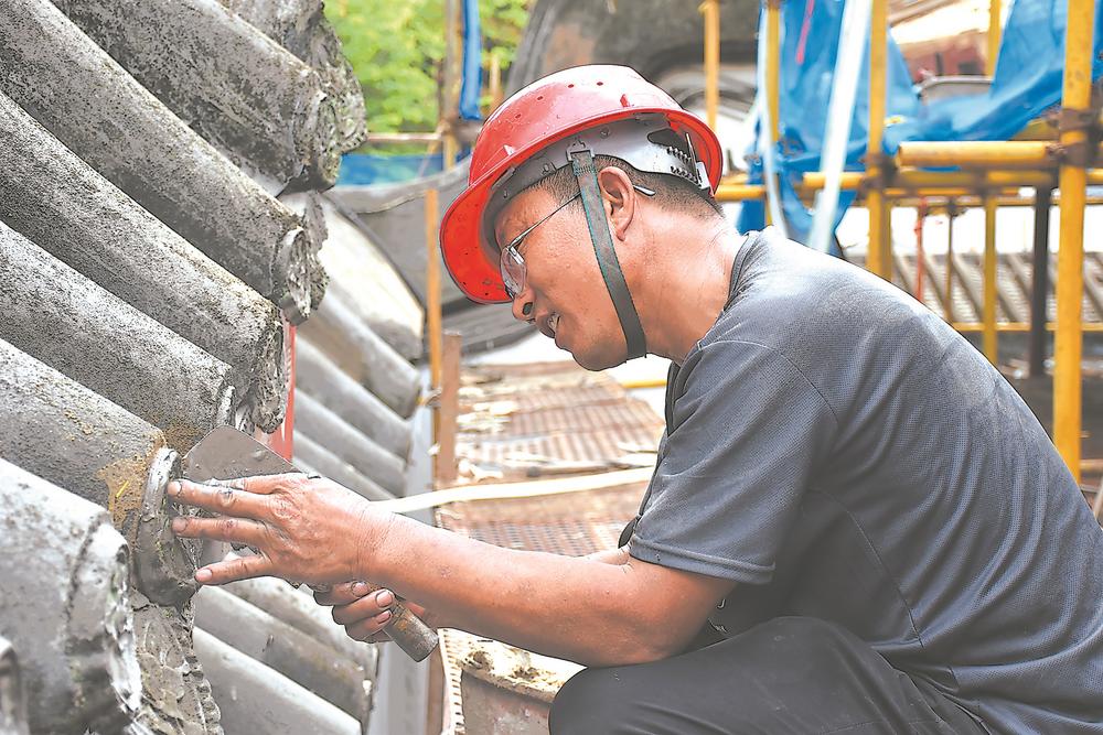 7月,全国文物行业顶尖高手齐聚四川泸州,大家比拼的是绝活儿,传承的是技艺,守护的是匠心。赛场上,面对“水土不服”的挑战,袁仕璨干了30年的“规矩”没变:对着图纸细细找位置,砖一块块砌,线一笔笔勾,每天8小时,手上一点不乱。“工人不能怕苦怕累,遇着难题,更要静下心,慢慢琢磨透。”