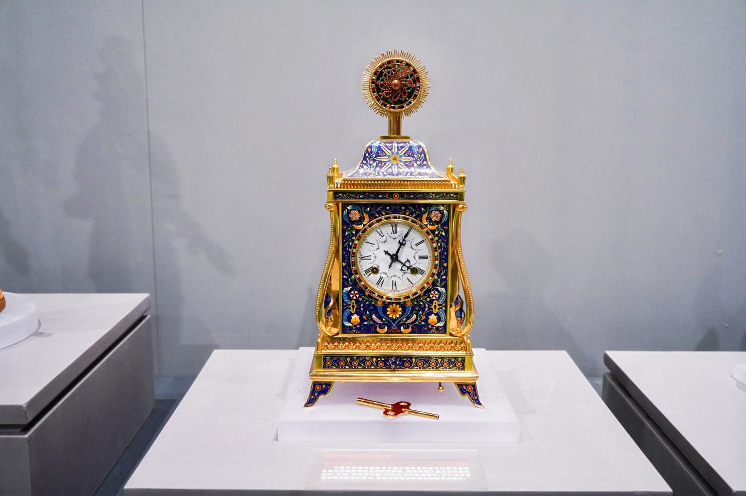 故宫博物院参展作者代表亓昊楠带来作品“铜镀金转花钟”。“这件钟表是根据故宫馆藏的钟表原件复现的,每到整点它会联动底部的音乐机芯奏响《茉莉花》,同时带动上部的顶花转动表演。”亓昊楠介绍,目前故宫里馆藏的钟表大约为1500件,涵盖了英国、法国、瑞士、清宫造钟处以及广州造钟处的作品。“虽然钟表仅占故宫馆藏文物的一小部分,但它是中西文化交融产物,凝聚着中西方劳动者的智慧。”