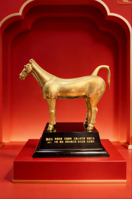 本次发布的“汗血宝马摆件”以茂陵博物馆“镇馆之宝”——汉代鎏金铜马为原型精心复刻。该文物通体鎏金、神骏非凡,不仅代表了汉代高超的青铜铸造工艺,更是丝绸之路早期中外文明交流的重要实证。据传,此马系汉武帝时期以西域进贡的汗血宝马为蓝本铸造而成。文创摆件精准还原其雄姿英发之神韵,底座镌刻“骐骥之选”四字,巧妙呼应2026年央视春晚“骐骥驰骋,势不可挡”的年度主题。